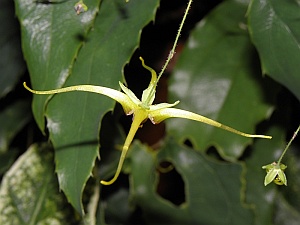 Die langen schmalen Petalen sind hellgelb und zur Blütenmitte hin braun, die Sepalen sind kurz und blass.